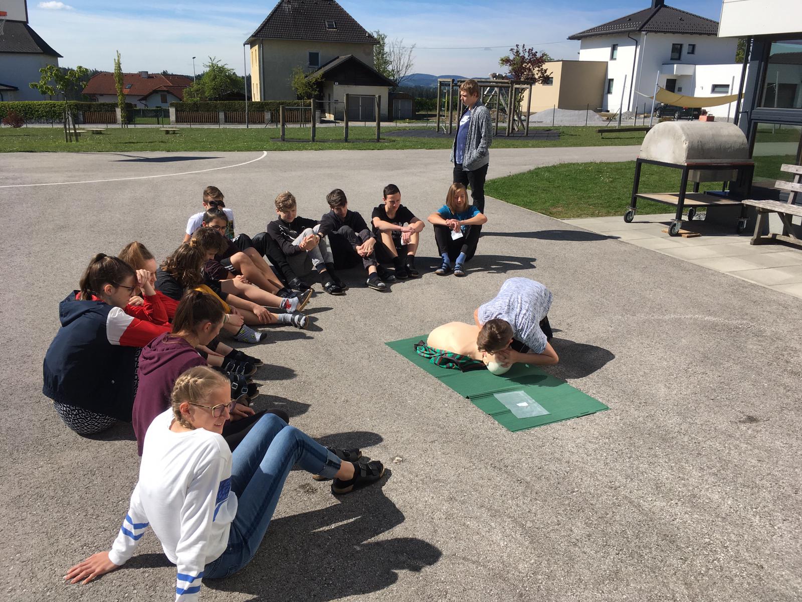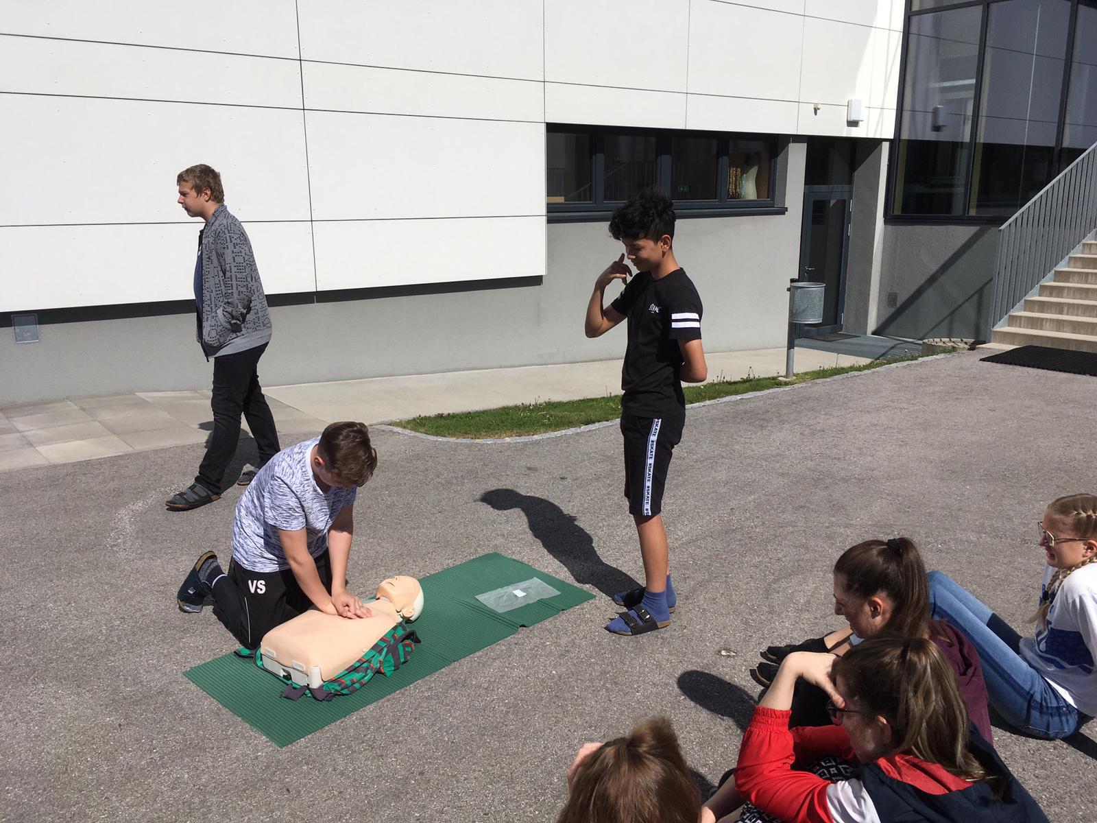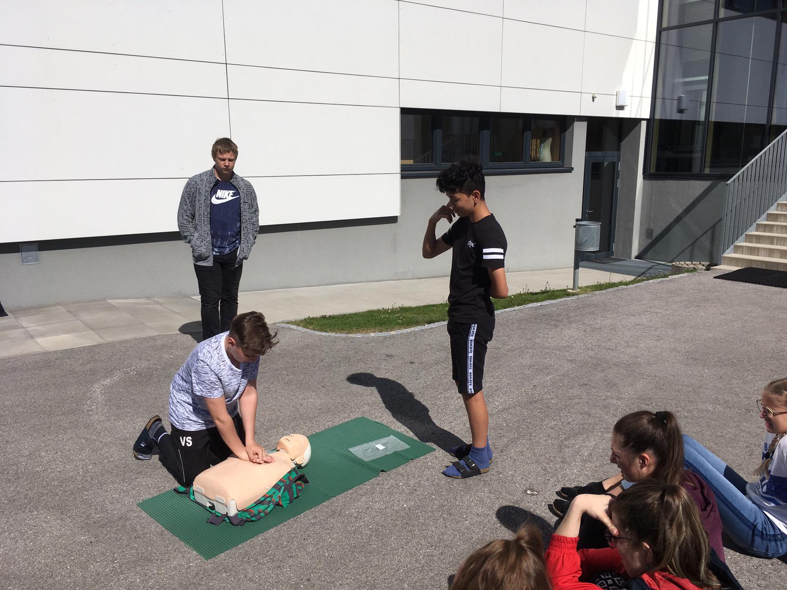 Mario Holzer, unser ehemaliger Sportlehrer und freiwilliger Helfer beim Roten Kreuz, brachte den Schülern bei, wie man Patienten richtig erstversorgt, einen Notruf absetzt, wiederbelebt, Verband anlegt und vieles mehr.