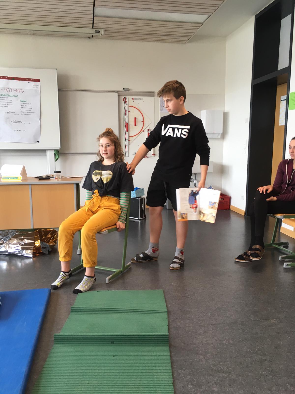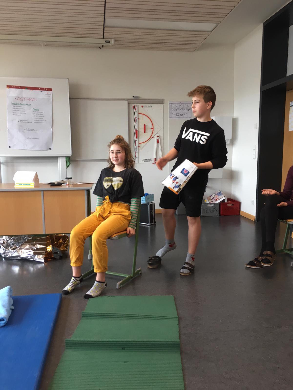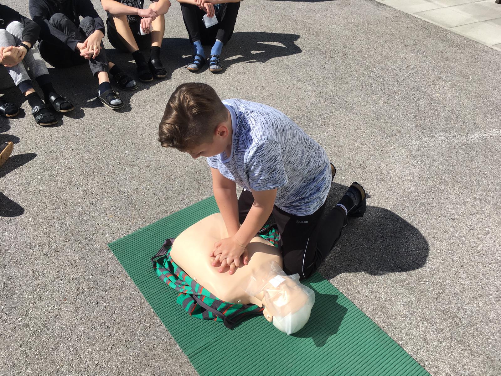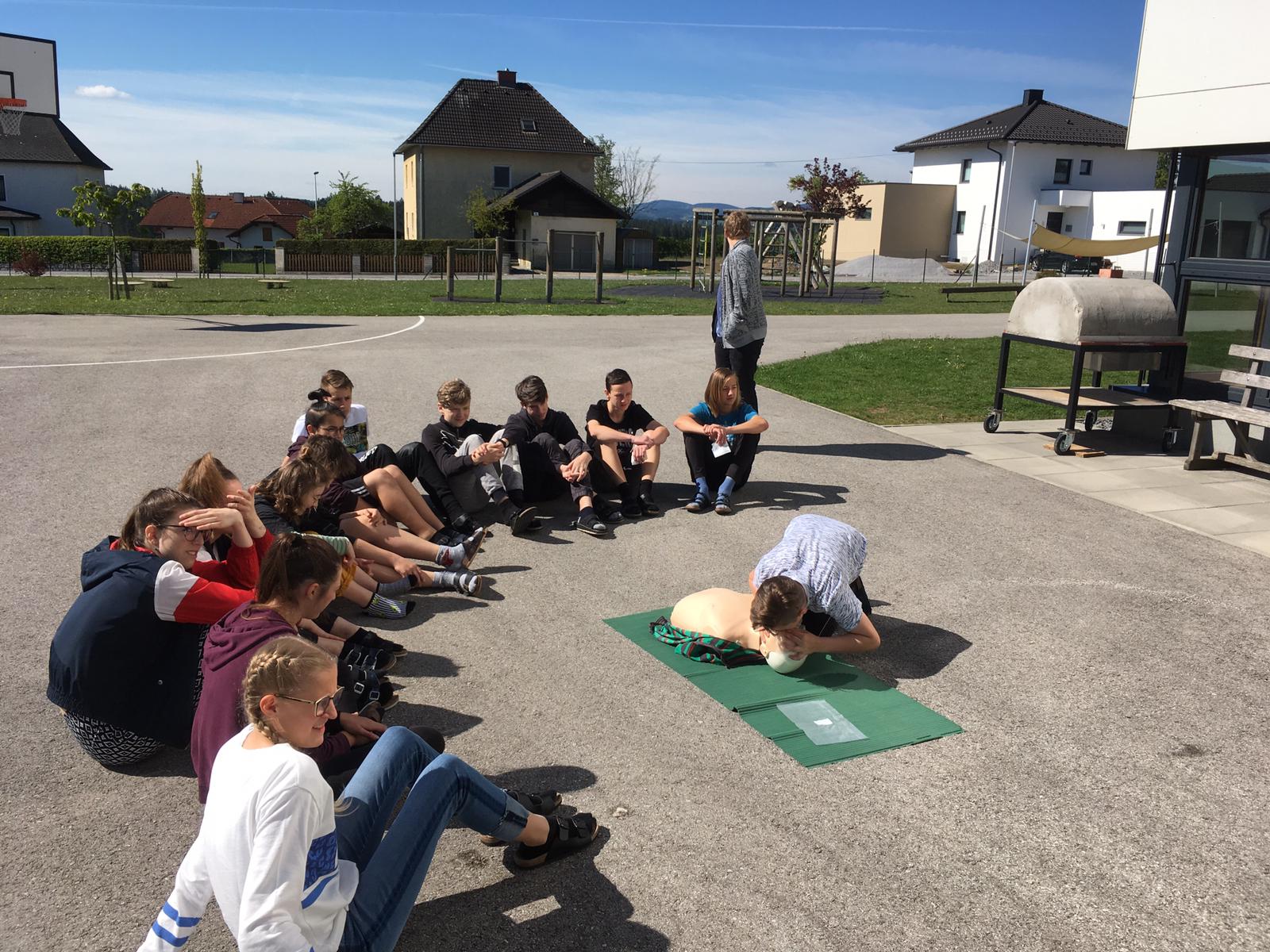 Mario Holzer, unser ehemaliger Sportlehrer und freiwilliger Helfer beim Roten Kreuz, brachte den Schülern bei, wie man Patienten richtig erstversorgt, einen Notruf absetzt, wiederbelebt, Verband anlegt und vieles mehr.