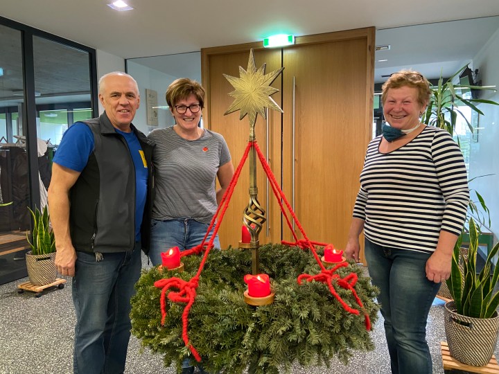 Am Bild zu sehen sind Erich Pröll, der für den Adventkranz eine Tanne aus seinem Wald zur Verfügung gestellt hat, Marianne Pröll und Brunhilde Röbl, die gemeinsam den schönen Adventkranz gebunden haben.