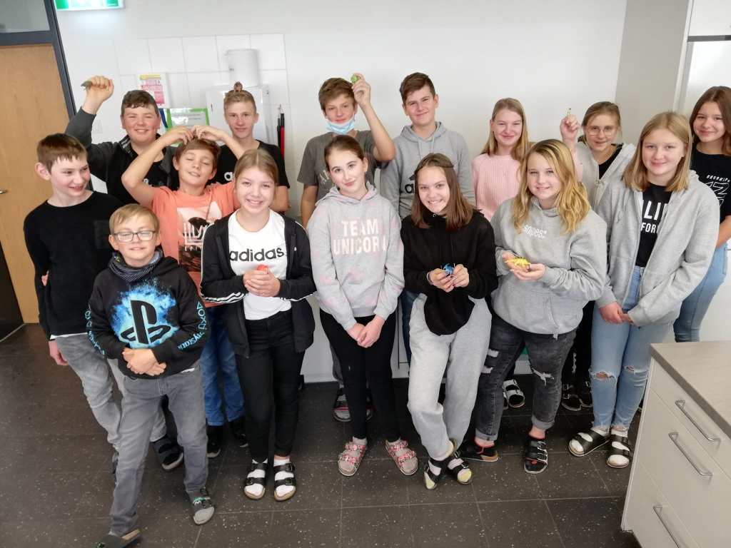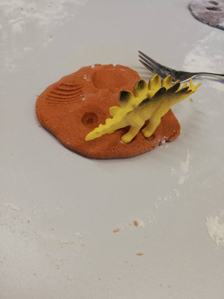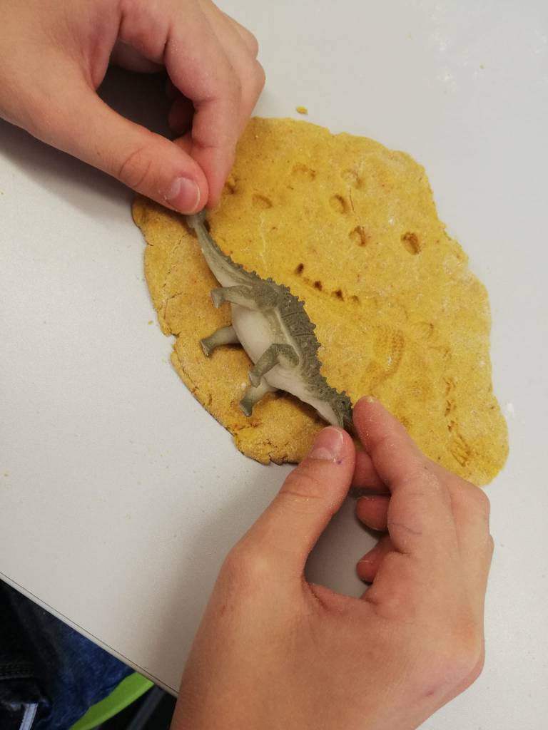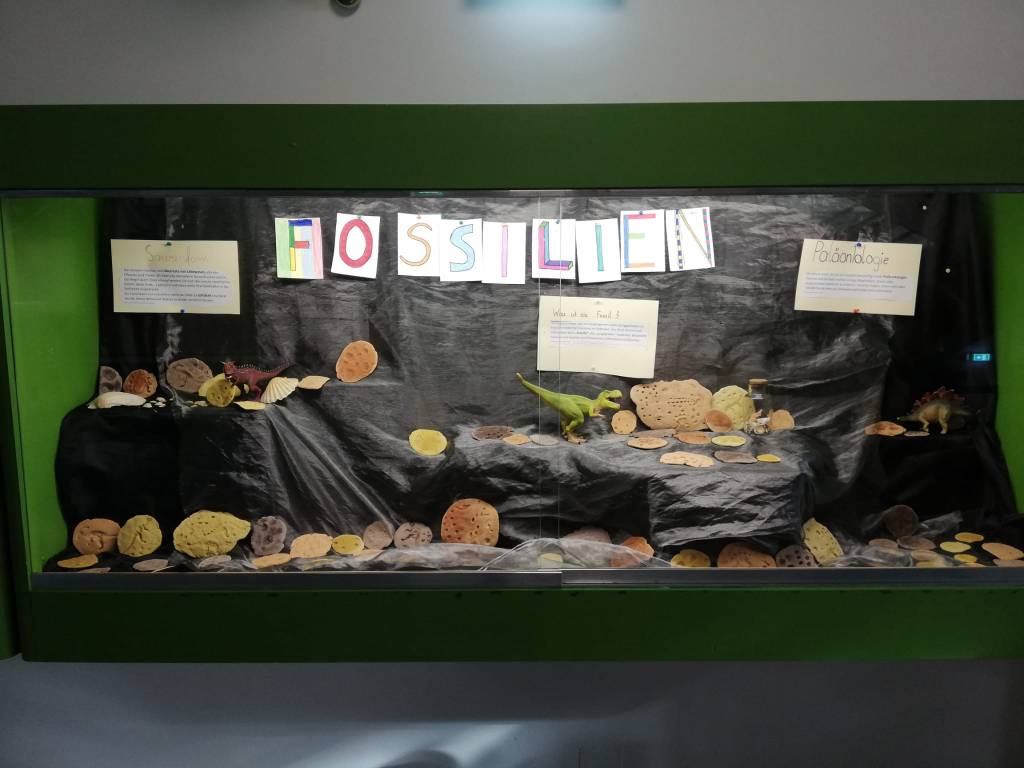 Die 3A und 3B beschäftigen sich in Biologie zurzeit mit der Entstehung des Lebens auf der Erde. Durch Fossilien kann man herausfinden, wie Tiere und Pflanzen früher lebten und wie sie aussahen. Besonders aus dem Zeitalter Mesozoikum findet man viele Fossilien von Dinosauriern. Die dritten Klassen haben passend dazu „Fossilien“ aus Salzteig hergestellt und ein Schaufenster in der Schule dazu gestaltet. Man kann Dinosaurier, deren Fußabdrücke, Schneckenhäuser und Muscheln erkennen.