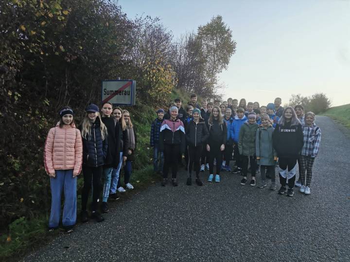 Die Schülerinnen und Schüler trafen sich je nach Wohnort in einer von neun Gruppen. Wir teilten sie in die Gruppen Leopoldschlag, Summerau, Zulissen, Kerschbaum, Deutsch-Hörschlag, Labach, Dreißgen/Vierzehn, Apfoltern und Rainbach ein. Begleitet wurden sie auf dem Weg in die Schule von zumindest einer Lehrkraft.