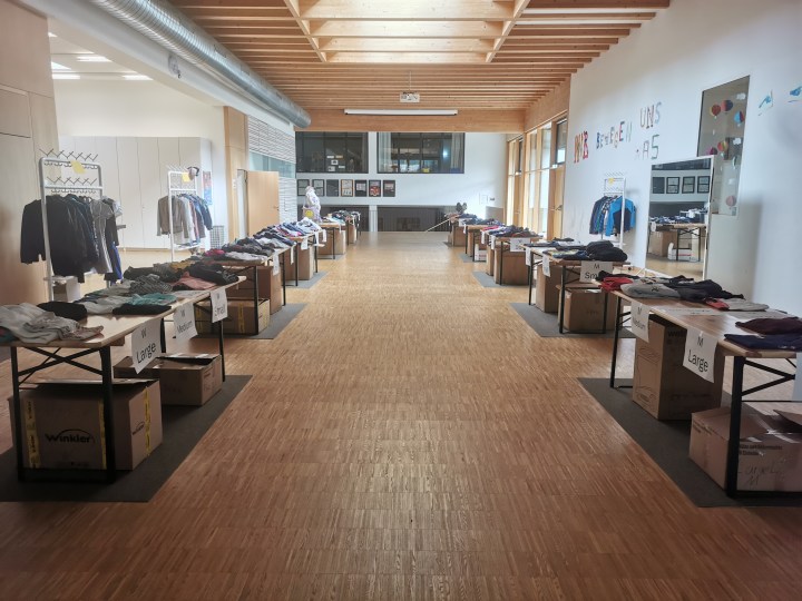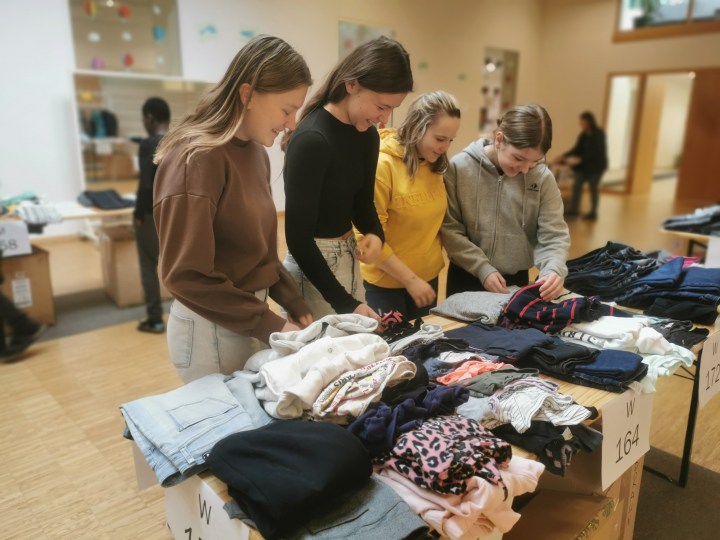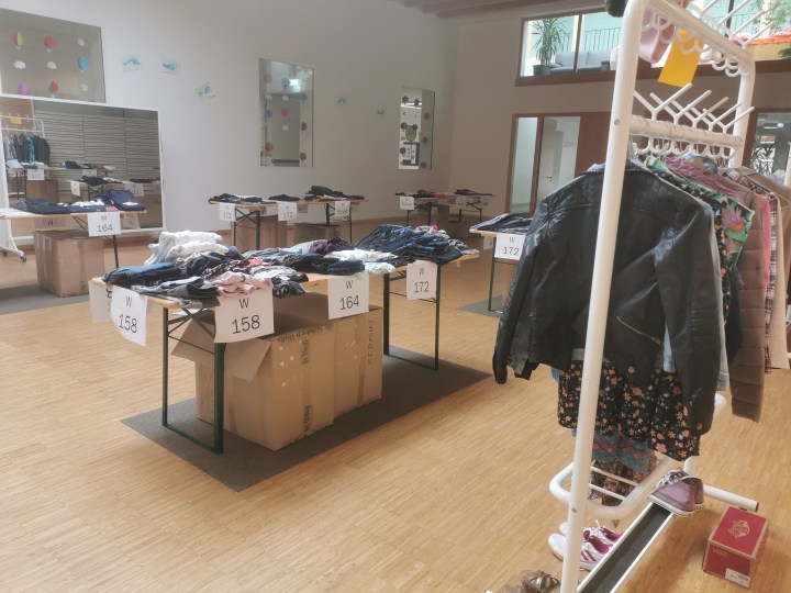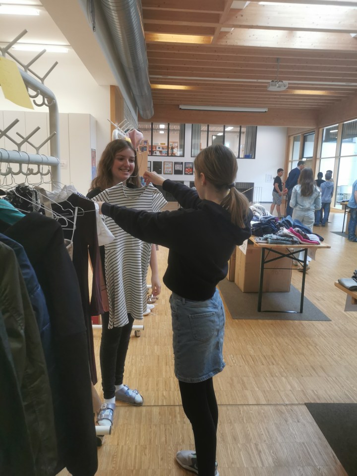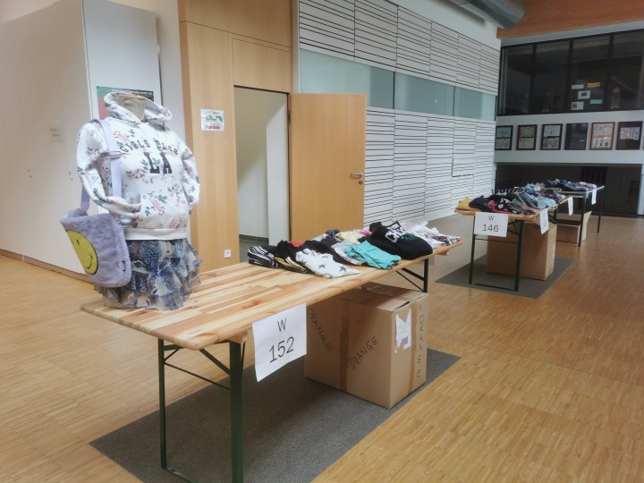 Die Schülerinnen und Schüler durften freiwillig Kleidungsstücke mitnehmen, die sie nicht mehr trugen, aber noch schön waren. Die unterschiedlichsten Dinge wie Fußballtrikots, Dirndlkleider und viele andere Stücke konnte man dort finden.