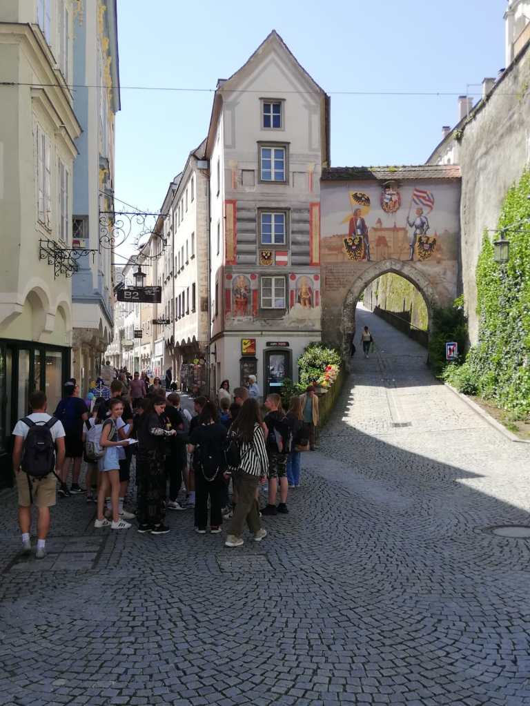 Danach erkundeten die Schüler:innen in Kleingruppen die Stadt Steyr: Ausgestattet mit Stadtplan und Arbeitsaufgaben, mussten sie Sehenswürdigkeiten suchen, Informationen finden, das Wappen der Stadt erfragen, Rätselfragen lösen und Beweisfotos machen. Als Abschluss gab es ein Eis bei herrlich, sonnigem Wetter.
