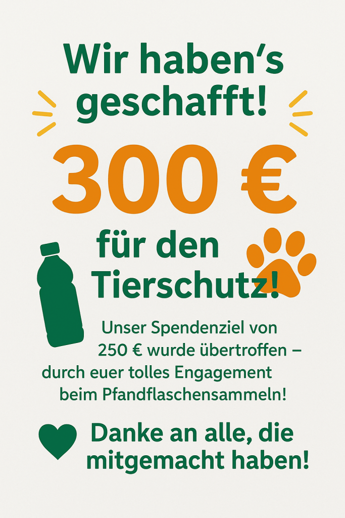Im Eingangsbereich wurde eine Sammelstelle für Pfandflaschen eingerichtet. Viele Kinder, Lehrkräfte und Mitarbeitende beteiligten sich begeistert und brachten ihre Flaschen mit. Mit Stolz können wir verkünden, dass unser ursprüngliches Spendenziel von 250 € sogar übertroffen wurde. Letztendlich waren fantastische 300 € im Spendentopf!